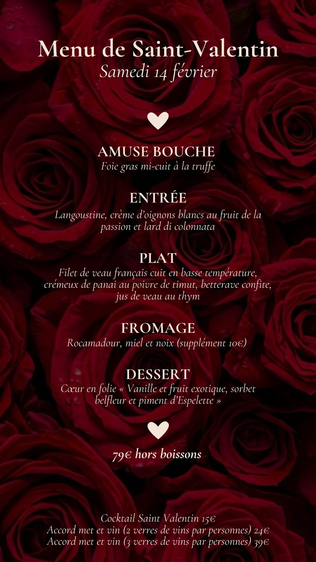 Celebrate love with an exclusive dinner prepared by the Chef de la Table vigneronne, specially designed for an unforgettable Valentine's Day at the Château on Saturday, February 14.